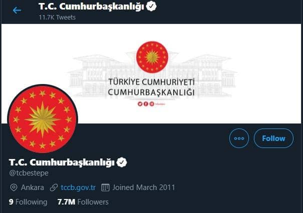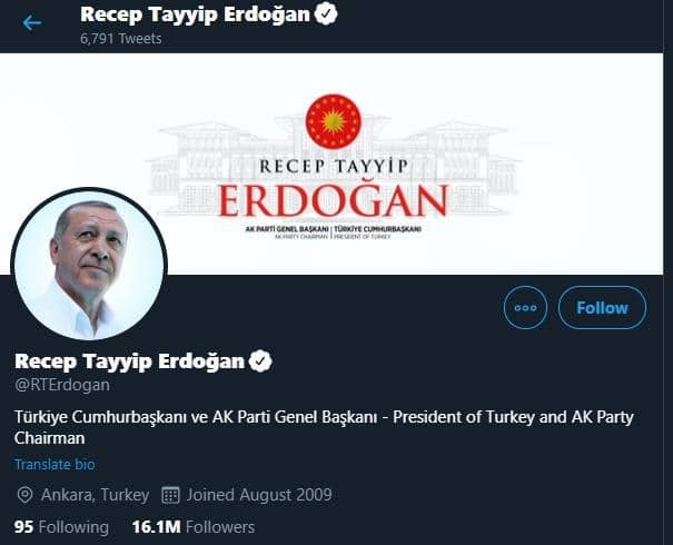 Pemimpin dunia selanjutnya yang memiliki jumlah followers terbanyak di Twitter adalah Presiden Turki Recep Tayyip Erdoğan. Akumulasi dari dua akun resminya, yakni @RTErdogan dan @tcbestepe memiliki jumlah followers mencapai 23,8 juta.
