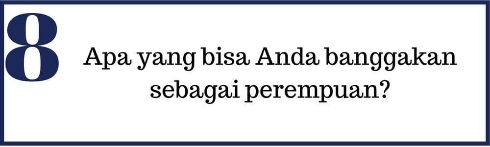 Sebagai perempuan yang bisa aku banggain dari aku, menurut aku sih aku perempuan yang mandiri, dan kalau boleh dibanggain, aku berprestasi diantara competitor lain yang rata-rata cowok semua.