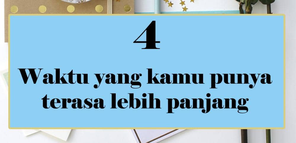 Kalau kamu bangun siang dan datang terlambat sampai kantor, maka hari akan terasa lebih singkat. Memasuki jam pulang kerja, kamu masih punya beberapa tugas sehingga harus lembur, padahal fisik dan pikiran kamu sudah lelah. Sedangkan tiba di kantor lebih pagi bisa membuat waktu kamu terasa lebih lama sehingga semua pekerjaan selesai dan bisa pulang tepat waktu.