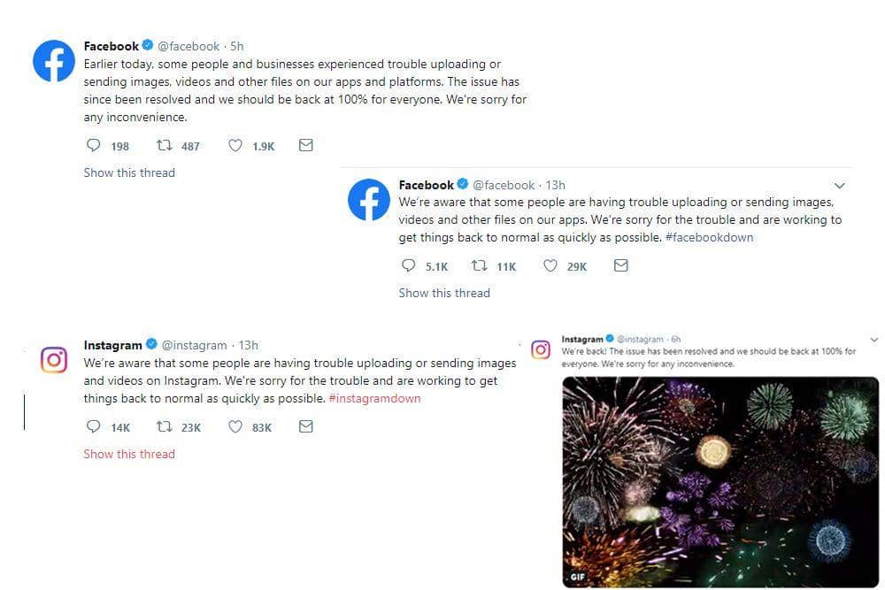 Setelah banyak yang kesal dengan gangguan yang ada, baik Instagram, Facebook dan Twitter sama-sama nge-tweet mengumumkan permintaan maaf mereka. “We’re aware that some people are having trouble uploading or sending images and videos on Instagram. We're sorry for the trouble and are working to get things back to normal as quickly as possible. #instagramdown”