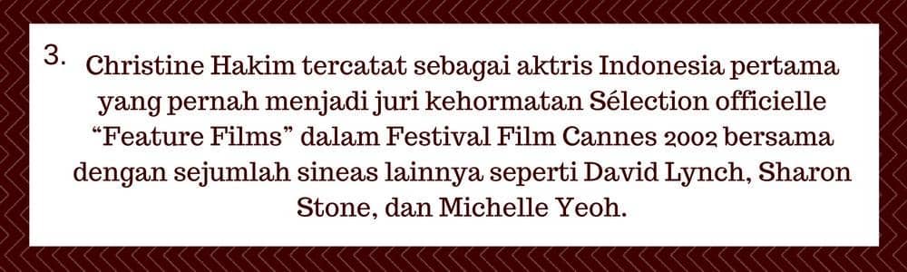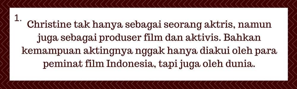 Tak heran Bela jika Christine Hakim terus mendapat penghargaan, jejak kariernya pun sudah ia jalani sejak tahun 1988 dan membuat namanya tercatat dalam film Hollywood Eat, Pray, Love bersama Julia Robert. Jika kamu mengetahui apa saja yang dilakukan Christine Hakim sepanjang kariernya, kamu akan mengaguminya karena;