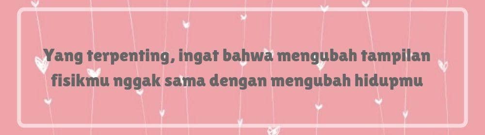 Pikiran-pikiran semacam ini baiknya cepat-cepat disingkirkan dari kepalamu. Kamu keliru kalau mengira kamu bisa didefinisikan hanya dengan angka. Berat badan, gaya rambut, dan sebagainya mungkin bisa kamu usahakan untuk berubah. Tapi, apabila kamu masih nggak sayang dengan diri sendiri kamu akan selalu menemukan ketidaksempurnaan dan ujung-ujungnya merasa kecewa.