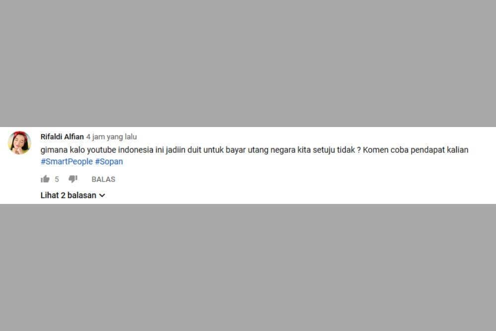 Wah, komentar yang satu ini out of the box sekali! Kamu pernah nggak kepikiran hal yang sama kaya yang “Rifaldi Alfian” katakan dalam komentarnya? Hihi, kira-kira bisa benar-benar diaplikasikannya nggak ya beberapa tahun ke depan? Pemerintah harus buat lembaga yang mewadahi Youtuber dulu deh sepertinya.