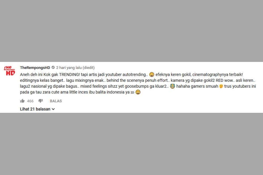 Pertanyaan ini diajukan salah satunya oleh “TheRempongsHD”. Ia menyebutkan pujian-pujian untuk video ini. Kamu setuju nggak nih sama komentar ini?
