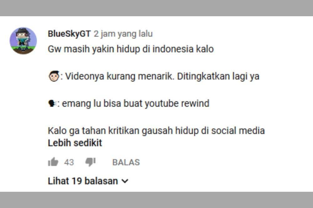 Komentar yang datang dari akun yang bernama “BlueSkyGT” ini cukup menarik perhatian. Dia menanggapi banyaknya komentar buruk di video itu. Menurutnya, sangat penting untuk membiasakan diri dengan setiap kritikan yang datang ketika bermain media sosial.