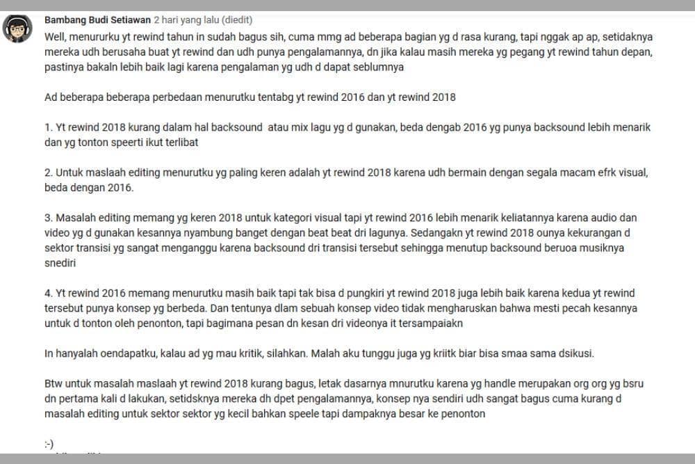 “Bambang Budi Setiawan” menyebutkan poin-poin yang dia perhatikan dari YouTube Rewind 2018 dengan video sebelumnya. Walaupun menurut Bambang, video ini masih jauh dari kata sempurna, usaha mereka untuk menciptakan sesuatu untuk Indonesia.