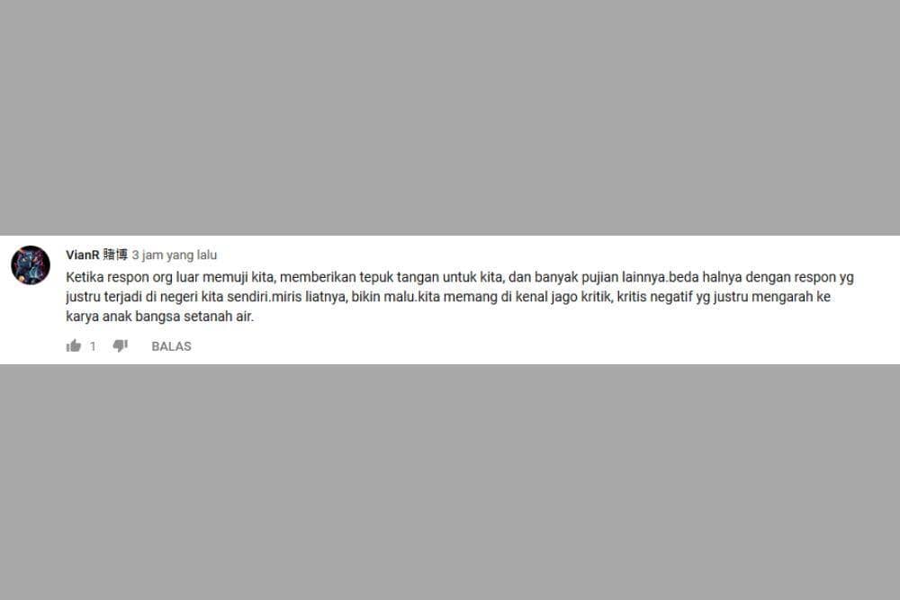 “VianR” menulis, “..Kita memang dikenal jago kritik, kritik negatif yang justru mengarah ke karya anak bangsa setanah air”. Waduh! Ada benernya sih, tapi sepertinya kita juga harus percaya kalau masih ada anak-anak muda yang memberikan kritik membangun dan positif untuk para kreator deh. Malah mungkin juga ikutan pengen jadi kreator.
