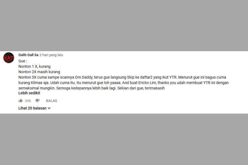 Satu komentar datang dari akun bernama “Galih Gall Sa”. Galih mengaku telah menonton video ini sampai 3 kali dan tetap merasa ada yang kurang dari videonya. “Menurut gue ini bagus cuma kurang klimaks aja,” kata Galih. Hmm..