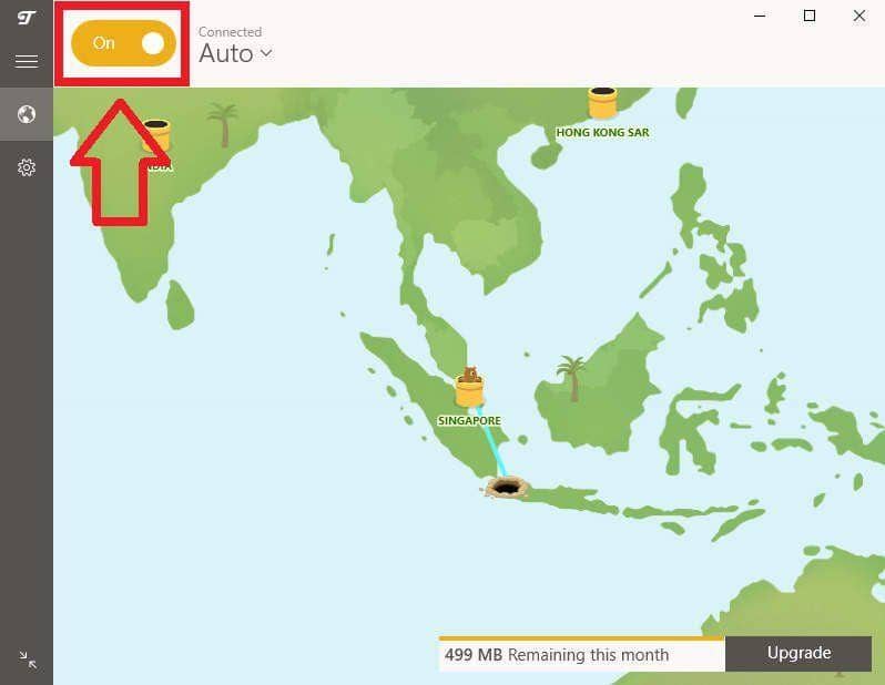 Langkah 1: Pertama-tama buka aplikasi TunnelBear VPN di PC kamu. Klik tombol tuas VPN yang ada di pojok kiri atas aplikasi seperti gambar di bawah ini