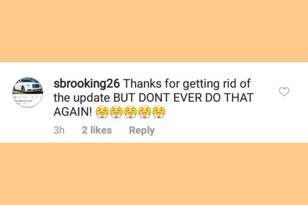 5. Pemilik akun @sbrooking26 menuturkan ucapan terima kasih karena Instagram cepat tanggap menghapus pembaruan aplikasinya. Tapi, di akhir kalimat pengguna ini juga ngegas meminta Instagram untuk nggak melakukan eksperimen yang serupa!