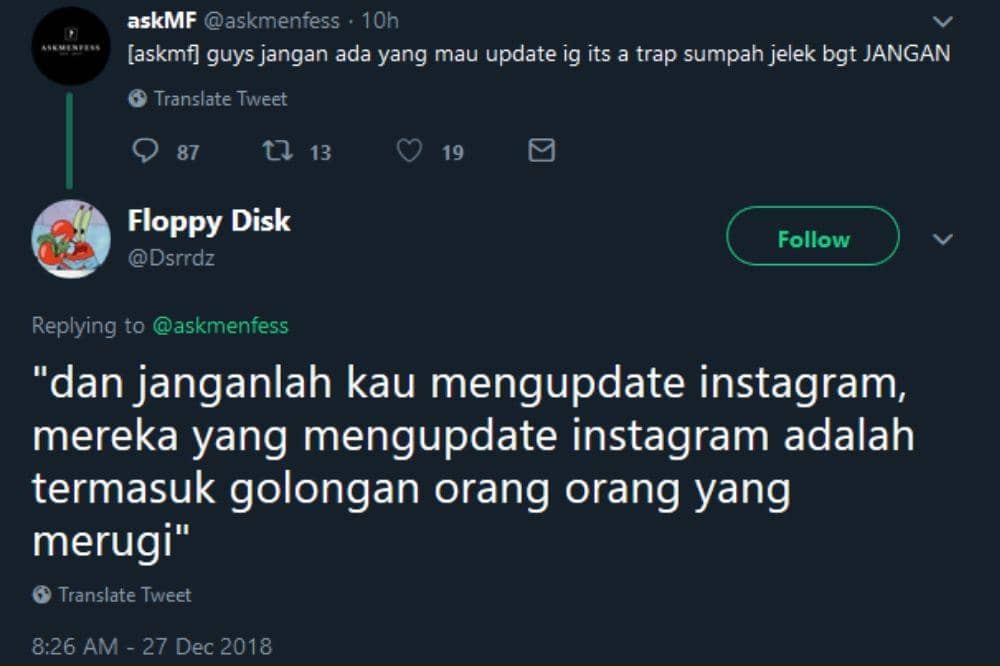 6. Ada cukup banyak balasan tweet akun @askmenfess tentang pembaruan aplikasi Instagram. Salah satunya yang paling lucu ini nih