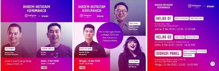 “Kreavi mendukung penuh program Akademi Instagram yang diselenggarakan secara virtual. Situasi pandemi ini memacu kita semua termasuk para pelaku UMKM untuk berpikir solusi kreatif, misalnya memanfaatkan platform daring secara penuh untuk pemasaran. Sebagai ekosistem anak muda kreatif, kami mendorong anak-anak muda yang tetap #BerkaryadiRumah untuk turut berkontribusi mendukung UMKM lokal. Kami harap Akademi Instagram #dirumahaja ini dapat membantu para pelaku UMKM meningkatkan wawasan mereka tentang dunia digital yang menyediakan banyak peluang bisnis bahkan di tengah masa sulit ini,” tambah Anto Motulz, Chief Executive Officer, Kreavi.