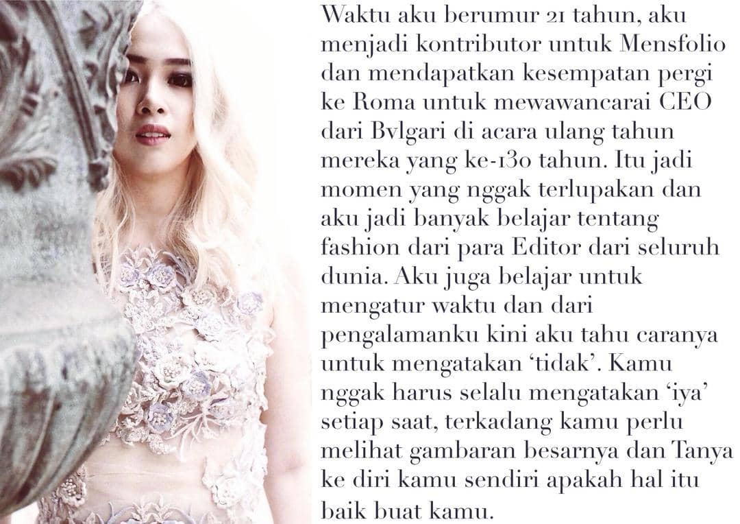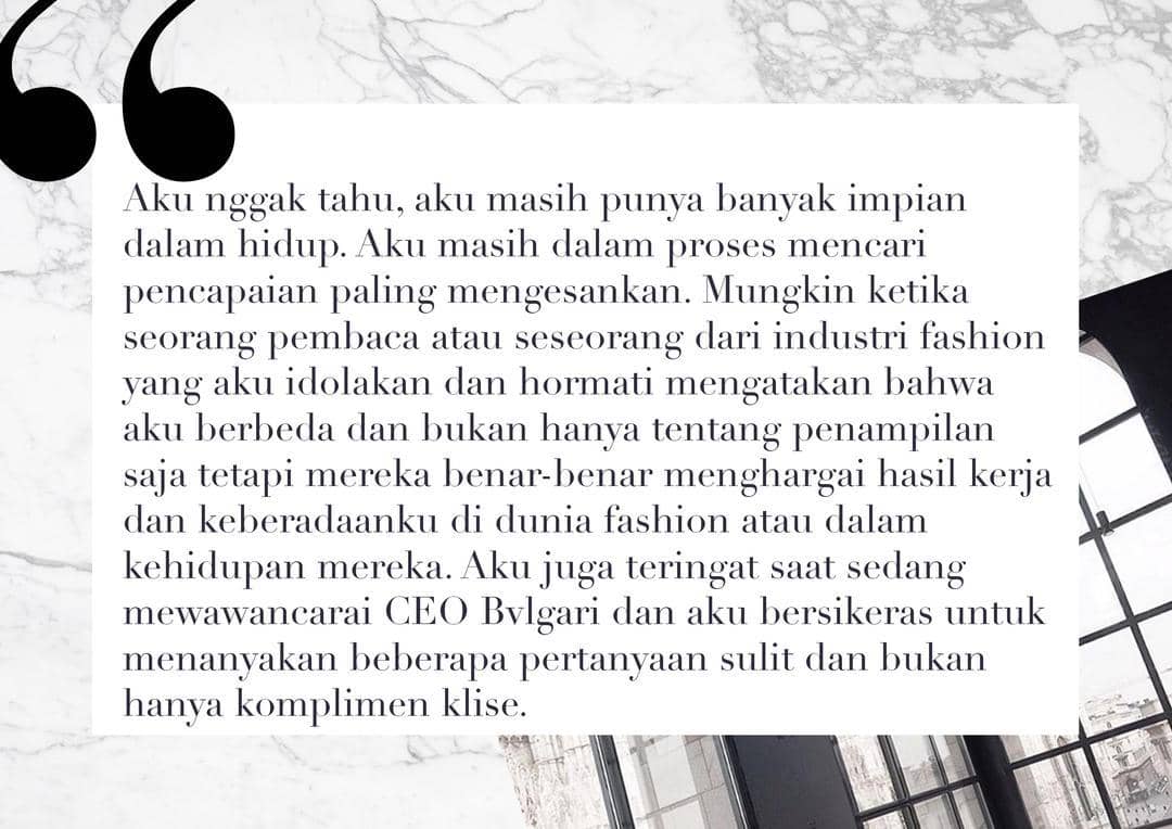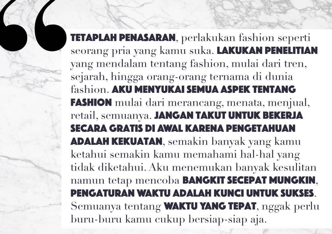 Bela, banyak yang mengira kalau berkarir di dunia fashion itu mudah. Tapi, nyatanya perlu banyak kerja keras dan pengorbanan. Aku pun butuh waktu yang lama untuk bisa mencapai posisi seperti sekarang ini. Ada banyak orang yang penasaran dengan perjalanan karirku dan meminta tips untuk bisa survive di tengah persaingan fashion. Di sini, aku merangkum semua pertanyaan yang pernah dilontarkan ke aku, semoga bisa jadi inspirasi buat kamu ya, Bela.