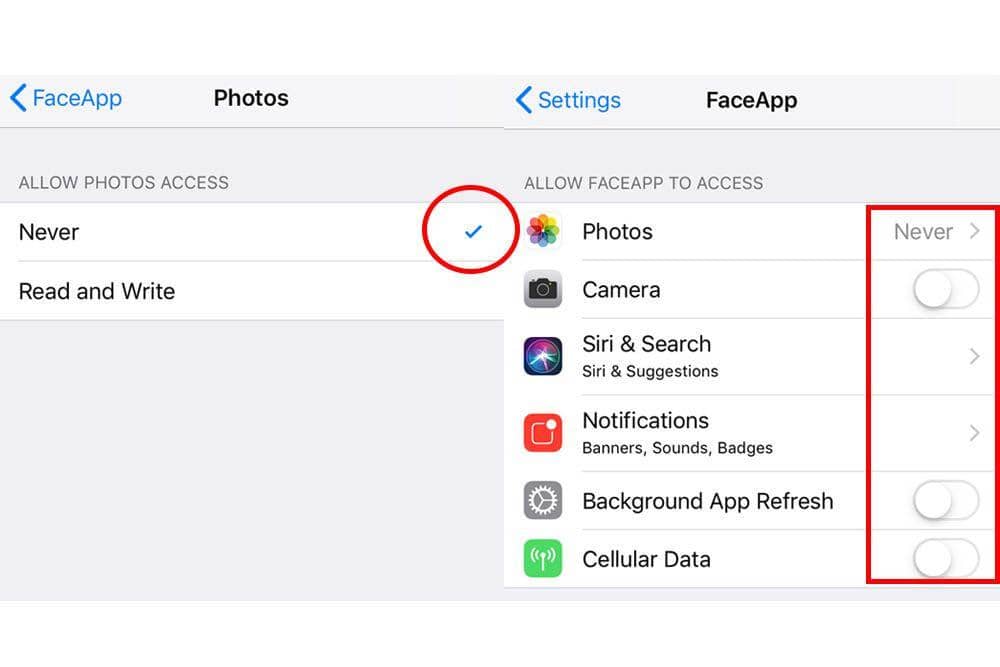 Tapi kalau kamu concern banget dengan privacy, selain uninstall FaceApp, kamu juga bisa menghindari si aplikasi membaca lokasimu berada. Caranya, ubah pengaturan pada iPhone atau Android milikmu, jika menggunakan iPhone, klik Setting > Slide ke bawah klik aplikasi FaceApp > lalu matikan tombol hijau Camera dan klik “Never” supaya FaceApp tidak bisa mengakses galeri fotomu, contohnya seperti di atas.