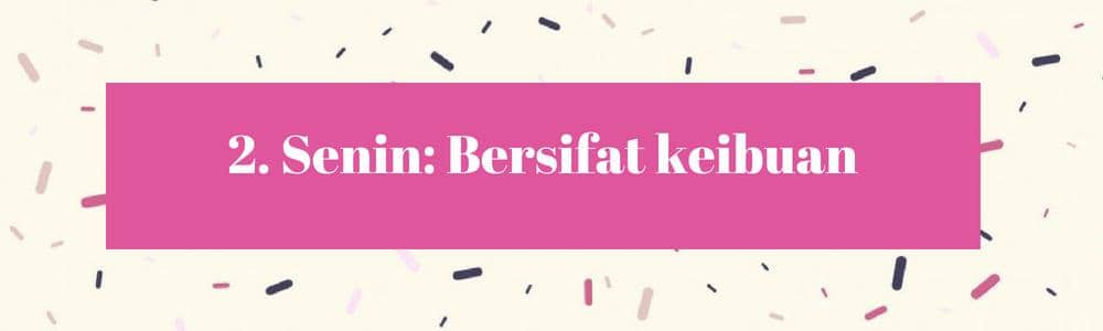 Dikendalikan oleh Bulan, maka orang yang lahir di hari Senin adalah orang yang bersifat keibuan. Mereka menekankan dedikasinya pada kebaikan dan keluarga. Orang yang lahir di hari Senin juga umumnya sensitif dan mudah beradaptasi. Tambahan lainnya, mereka dikenal memiliki penampilan yang menarik, loh!