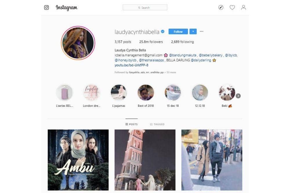 Di posisi kelima sebagai akun followers Instagram terbanyak di Indonesia ada Laudya Chintya Bella dengan jumlah 25,8 juta. Pada akun tersebut, Bella lebih sering mengunggah foto kesehariannya bekerja, hingga saat quality time bersama dengan suami dan anaknya. Namun, tak lupa, Bella juga mengunggah foto promosi bisnis yang tengah ditekuninya.