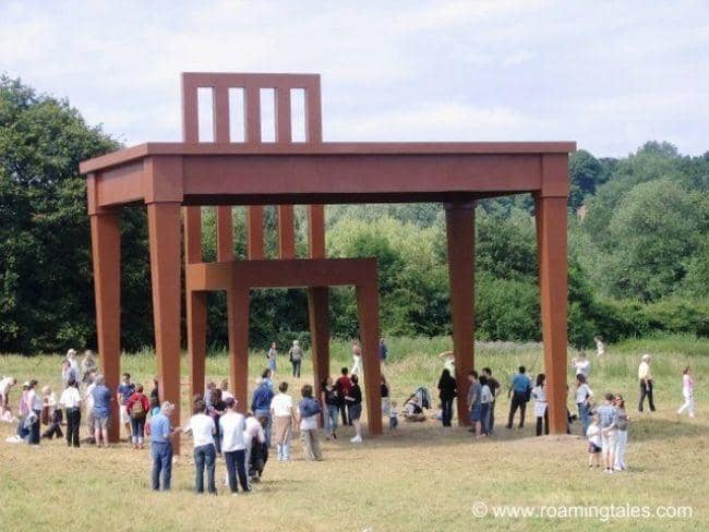 Tidak, ini bukanlah orang-orang berskala mini ataupun trik kamera, tetapi ini adalah meja raksasa yang menjadi pajangan seni yang dipasang di Hampstead Heath, London.