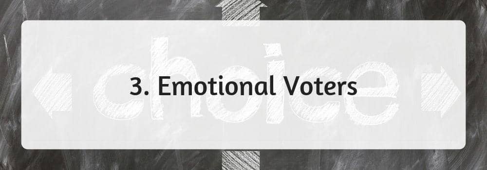 Tipe pemilih selanjutnya adalah pemilih emosional terdapat sebanyak 29,8%. Pemilih tipe ini cenderung memilih partai atau kandidat yang memiliki latar belakang agama dan figur. Mereka biasanya sudah memiliki ketetapan yang sangat kuat terhadap pilihannya.