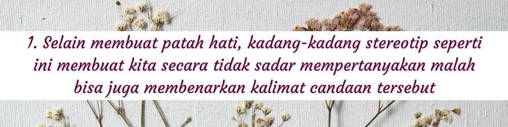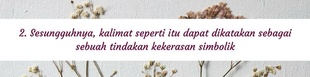 Nggak heran wanita jadi sering menjadi korban kekerasan baik kekerasan fisik maupun kekerasan verbal seperti ini akibat dari stereotip yang sudah melekat di otak manusia sejak lama. Tidak hanya para pria, sesama wanita pun kadang secara tidak sadar menghina satu sama lain. Jangan sampai kamu menjadi korban bahkan menjadi ‘tersangka’ dalam sebuah kekerasan ini. Menjadi ‘tersangka’ dengan menghina sesama, sama sekali tidak ada untungnya dan tidak membuat kamu terlihat menjadi wanita yang kuat. Menjadi wanita kuat dapat dimulai dari diri sendiri dengan mematahkan stereotip yang sudah mendarah daging di dalam diri manusia.