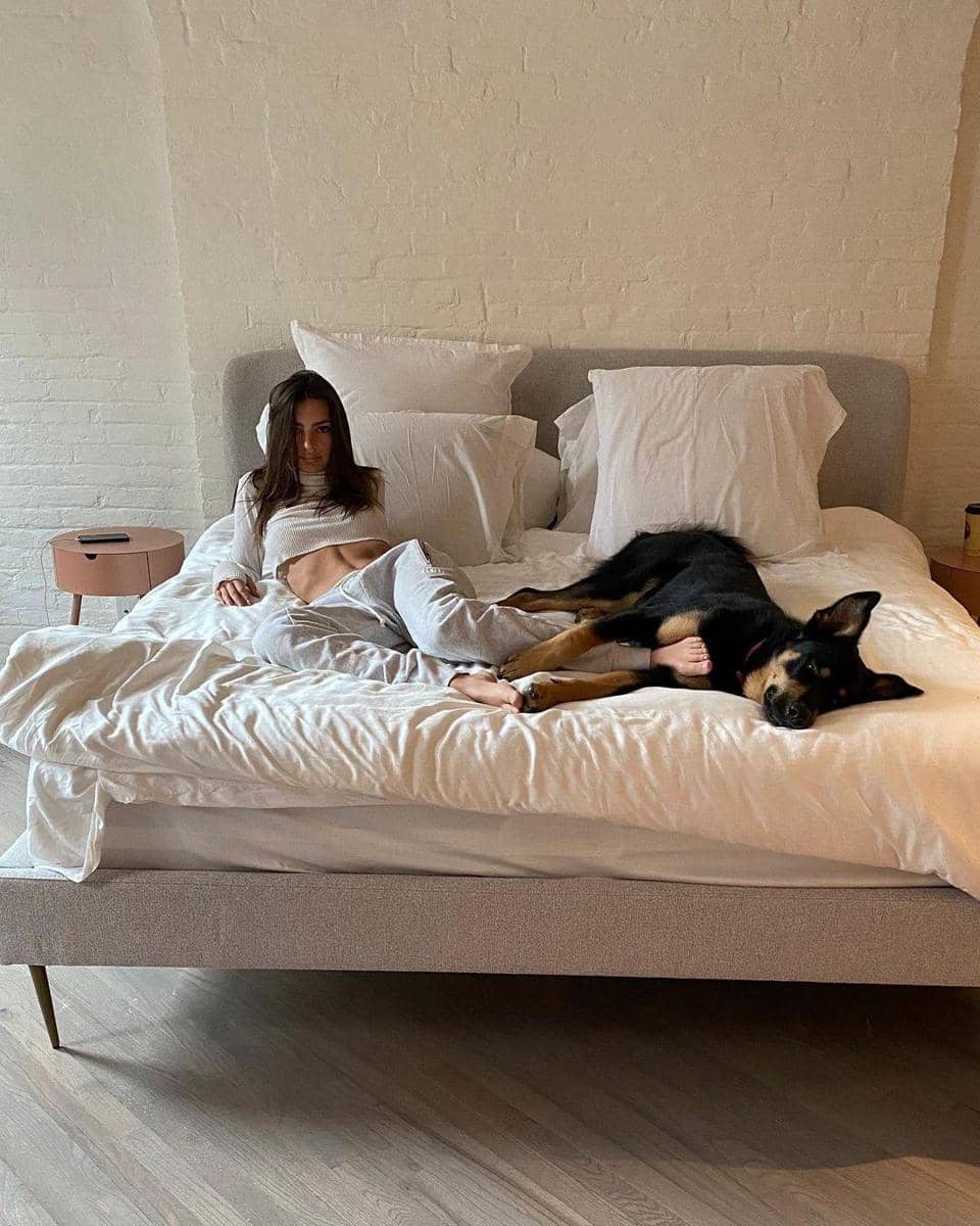 Model yang kerap dikenal sebagai Emrata ini pernah membagikan penampakan ruang tamu di rumahnya. Banyak sekali foto Emrata yang berlatar sofa beludru berwarna mint. Di dukung dengan jendela dan pitu kaca yang besar cahaya masuk dengan baiknya memantulkan cahaya dari meja kopi marmer merah muda salmon dan karpet anyaman multi-warna.