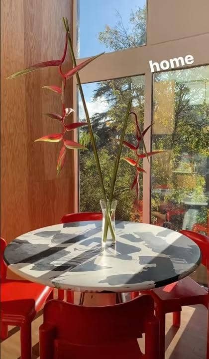Emily memang jarang mengunggah bagian ruang makannya. Namun, sesekali ia pernah membuat story yang menunjukan sebuah meja bundar berbahan marmer dengan motif monokrom, dikelilingi kursi akrilik bergaya tahun 60-an dengan warna merah cerah.