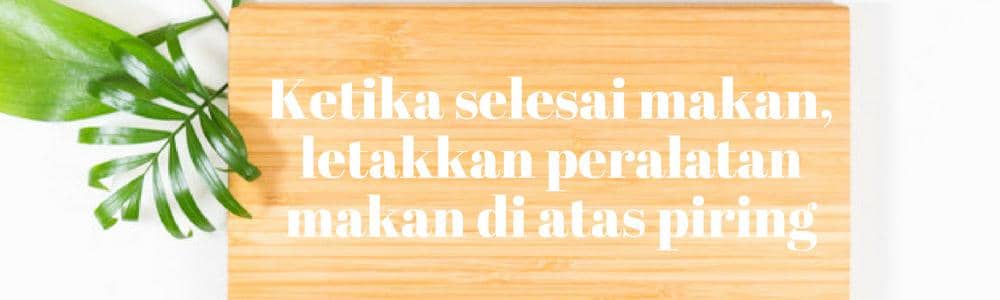 Jika kamu sudah selesai makan, berikan signal dengan menyusun peralatan makan seperti garpu dan pisau diatas piring dengan keadaan terbalik. Jika kamu tidak mampu menghabiskan makanan kamu, jangan meminta untuk membungkus makanan kamu kepada pelayan.