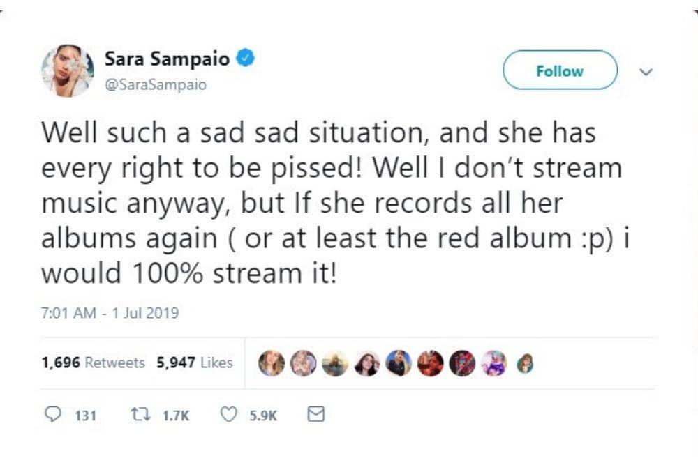 "Selama bertahun-tahun aku bertanya, memohon kesempatan untuk memiliki karya yang pernah aku buat sendiri. Namun yang kudapat malah sebaliknya. Aku diberi kesempatan untuk bergabung kembali ke Big Machine Records dan 'mendapatkan' satu album kembali sekaligus, satu untuk setiap album baru yang aku masukkan, bukan album yang terdahulu,” jelas Swift.