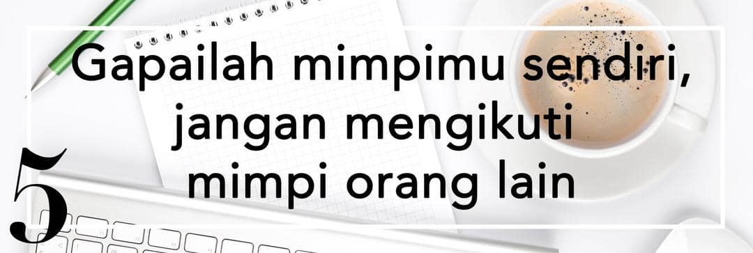 Dakilah gunungmu sendiri, jangan mendaki gunung orang lain. Pepatah ini harus kamu pegang dan renungkan dalam-dalam. Jika kamu merasa tidak bisa melakukan sesuatu, maka tinggalkan setelah berusaha semaksimal mungkin. Sudah saatnya kamu berpikir panjang dan bermimpi setinggi mungkin. Rencanakanlah segala sesuatu seperti saat kamu dalam keadaan paling buruk.