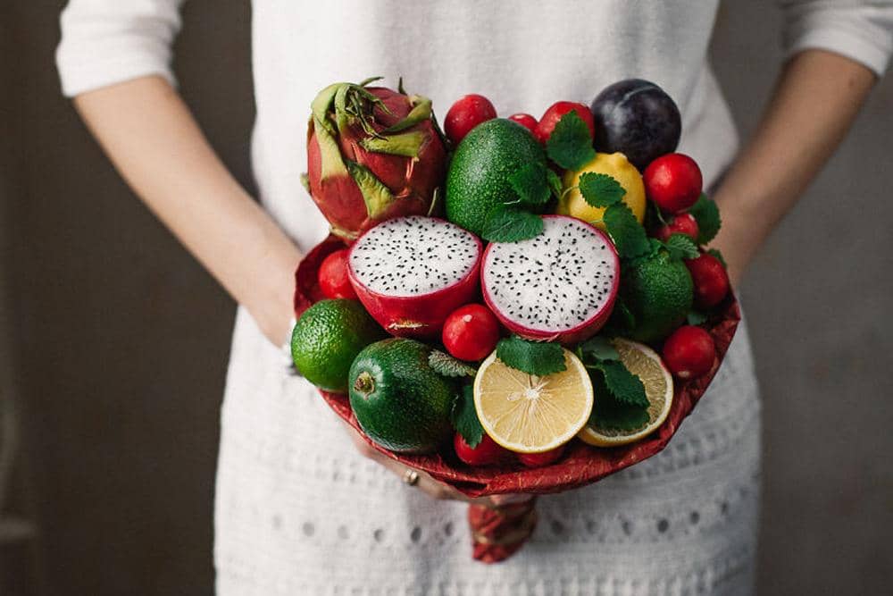 1.Karangan bunga ini terdiri dari buah-buahan segar, antara lain alpukat,buah naga, lemon dan lobak.