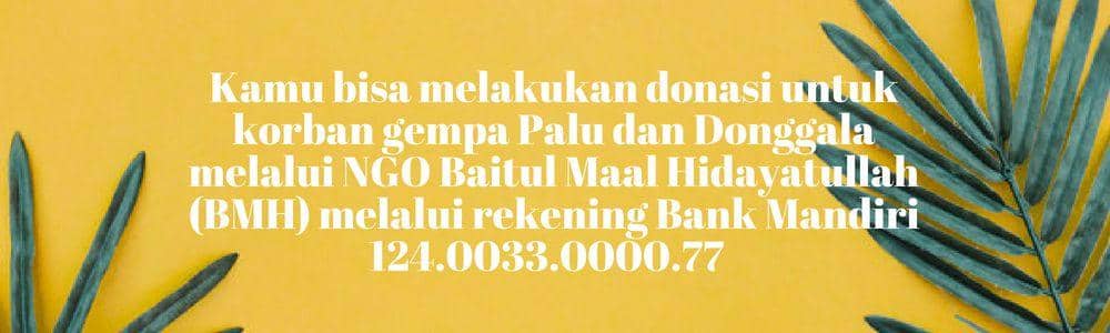 Kamu bisa melakukan donasi untuk korban gempa Palu dan Donggala melalui NGO Baitul Maal Hidayatullah (BMH) melalui rekening Bank Mandiri 124.0033.0000.77