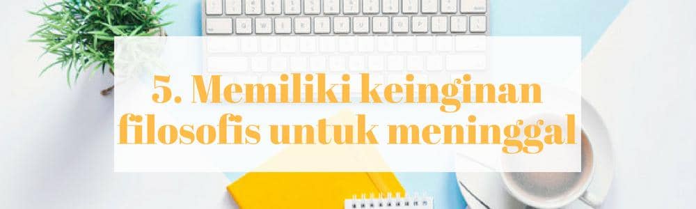 Percaya atau nggak, ada beberapa orang yang memutuskan untuk bunuh diri karena menginginkan hal itu. Mereka biasanya memiliki pemikiran seperti ini karena terserang penyakit serius dengan kemungkinan hidup yang kecil. Orang seperti ini nggak mengalami depresi, gangguan kejiwaan, cengeng, atau meminta pertolongan. Mereka berusaha mengendalikan takdir dan meringankan penderitaannya yang umumnya bisa selesai dengan kematian.