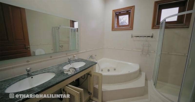Kamar utama milik Thariq juga dilengkapi dengan kamar mandi pribadi. Kamar mandi tersebut memiliki fasilitas yang cukup lengkap, seperti area shower, bath tub, dan dua wastafel. Bath tub tersebut memiliki bentuk segitiga yang berada di salah satu sudut kamar mandi.