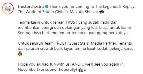 Itu tadi beberapa kejutan dari konser 'The Legends 8 Replay: The World of Studio Ghibli x Makoto Shinkai' oleh TRUST Orchestra kemarin. Kamu sempat datang, nggak?