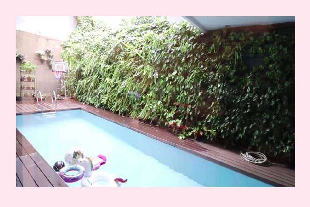 3. Ruang santai dan kitchen studio di rumah ini kemudian menghadap langsung kolam renang berlantai kayu yang minimalis dan asri. Ban renang milik Gempi yang cute jadi buat salah fokus, nih!