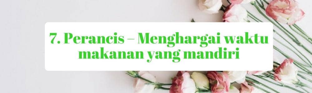 Kebiasaan orang Perancis yang patut kita contoh dalam hal makanan. Orang Perancis makan dengan enjoy tanpa khawatir akan kelebihan berat badan. Kebiasaan orang Perancis dalam hal makan yang patut kita tiru adalah mereka tidak terburu-buru saat makan, mereka mengunyah makanan dengan perasaan, menghargai suatu makanan. Mereka bisa berlama-lama di meja makan sambil berdiskusi kecil antar keluarga.