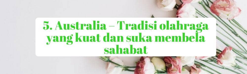 Australia merupakan negara dengan tradisi olahraga yang kuat. Masyarakatnya sangat menyukai olahraga, baik sebagai penonton maupun sebagai peserta. Prestasi atlet Australia di arena event olahraga internasional tidak bisa disepelekan. Hal ini terjadi karena adanya dukungan dari berbagai pihak, yaitu pembinaan atlet yang baik. Berkat dukungan dana pembinaan atlet yang cukup besar dari pemerintah serta dukungan sponsor, menjadi atlet olahraga bisa menjadi salah satu karier yang menjamin di Australia.