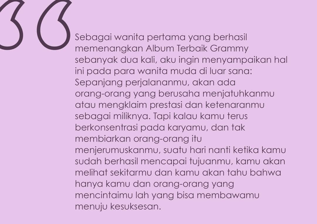 Pelantun lagu Bad Blood, Taylor Swift, berhasil memenangkan dua kategori penghargaan di ajang anugerah musik bergengsi Grammy Awards ke-58. Dua penghargaan yang dibawanya pulang yaitu Album Terbaik dan Video Musik Terbaik. Saat ia dipanggil untuk menerima penghargaannya untuk album kelimanya 1989, Taylor tampak sangat terkejut. Ternyata. pidato yang ia sampaikan pun berhasil membuat kita semua terkejut dan terkagum-kagum.