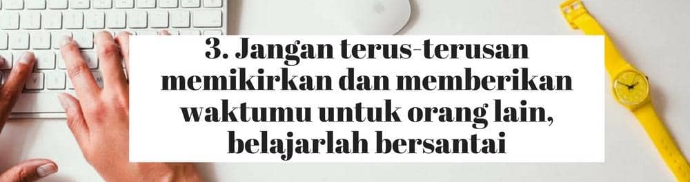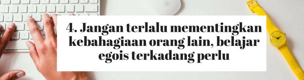 Kalau selama ini kamu selalu dan terlalu mementingkan kebahagiaan orang-orang di dekatmu, sekarang waktunya kamu memastikan kebahagiaan untukmu sendiri. Penuhi kebutuhanmu, apapun itu. Buat dirimu memiliki energi untuk menjalani aktivitas keseharianmu. Egois itu perlu, belajarlah berkata tidak pada yang lainnya. Berhentilah untuk senantiasa melakukan hal-hal yang diminta orang lain. Sesekali berkata kamu keberatan pun tak ada salahnya.