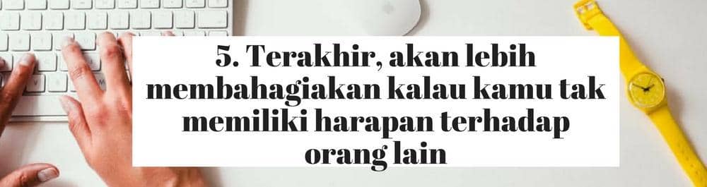 Mungkin saja kamu pernah berharap, sahabatmu akan selalu ada saat kamu butuhkan. Kekasihmu akan selalu datang ketika kamu butuh pertolongan. Hanya karena kamu berharap demikian, bukan berarti mereka kemudian akan melakukannya. Dan ketika yang terjadi adalah sebaliknya, maka kamu akan kecewa, dengan begitu maka kamu akan sulit bahagia. Sebab, bisa dikatakan jika kebahagiaanmu tergantung pada yang orang lain lakukan padamu. Bukan begitu? Apa kamu suka kalau orang lain mengharapkanmu melakukan sesuatu?
