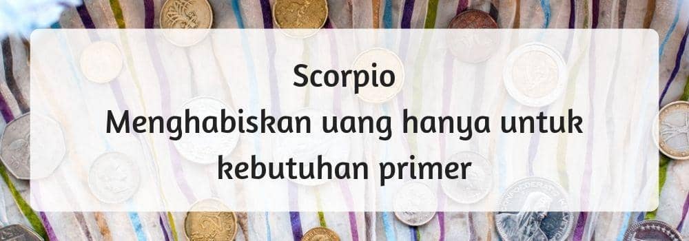 Menghargai strategi dan kendali, Scorpio senang bermain dalam permainan keuangannya. Mereka mencoba menabung secara teratur, menghabiskan pendapatannya hanya untuk kebutuhan primer, dan bekerja keras untuk dapat menempatkan dirinya dalam keadaan keuangan yang lebih baik. Scorpio selalu mempertimbangkan berbagai aspek sebelum membuat keputusan untuk membeli atau berinvestasi pada sesuatu. Ketika Scorpio sudah memasang tujuan, nggak ada yang bisa menjadi penghalangnya untuk menggapai itu.