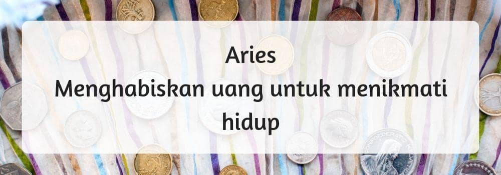 Dikenal dengan sifat mudah marah dan senang mengambil risiko, Aries senang menikmati hidup dan menghabiskan uang tanpa memikirkan hari esok. Namun karena itu pula, mereka akan bekerja keras untuk dapat menggunakan pendapatannya secara maksimal. Jika menginginkan sesuatu, Aries akan melakukan segala cara untuk mendapatkannya. Penting bagi Aries untuk mengalihkan semangat ini ke arah menabung sehingga membantu mereka untuk dapat melanjutkan gaya hidup yang serba cepat ini.