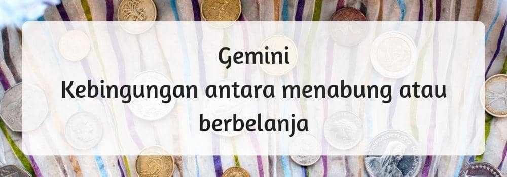 Zodiak Gemini adalah pribadi yang pintar dan dinamis, selalu mau mengejar sesuatu yang baru, yang dengan kata lain dapat membuatnya mengeluarkan simpanan sendiri. Gemini sering kebingungan dengan pikirannya yang mengharuskannya untuk menabung dan kata hatinya yang selalu menyuruhnya untuk berbelanja (terutama membeli makanan). Akan sangat sulit untuk membuat keputusan antara menjadi praktis atau kesenangan. Namun, Gemini selalu punya rencana cadangan yang dapat menjaga keuangannya tetap aman. Mengunci diri di kamar, faktanya adalah satu-satunya cara untuk menghindari pengeluaran berlebihan agar dapat menghabiskannya pada sesuatu yang lebih penting.