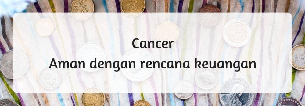 Mereka yang berzodiak Cancer sangat emosional, yang membuatnya mencari rasa aman dengan membuat rencana keuangan. Cancer akan membuat uang sebagai prioritasnya, meyakini kalau benda itu adalah kunci hidup yang bahagia dan sehat, serta selalu cepat menolong keluarga atau teman yang sedang mengalami kesulitan. Mereka sering jago dalam berinvestasi dan juara dalam mencatat seluruh aktivitas keuangan yang ia lakukan.