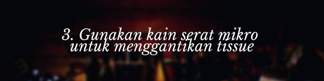 Seringkali reaksi pertama yang kita lakukan saat membersihkan tumpahan apapun kita akan mengambil tissue yang setelah dipakai akan langsung kita buang. Jika ingin mengurangi penggunaan tissue ternyata masih ada alternatif yang lebih murah dan ramah lingkungan yaitu menggunakan kain pembersih mikrofiber dan segera cuci setelah penggunaannya karena dapat digunakan secara berulang-ulang.