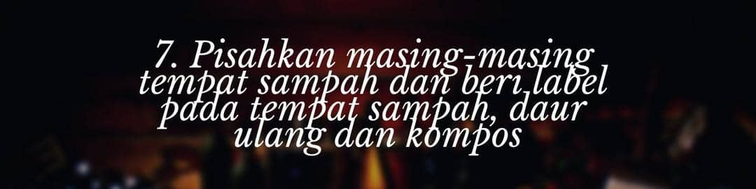 Yuk biasakan membuang sampah pada tempatnya sesuai kategori, karena akan mempermudahkan proses pemilahan sampah.Pisahkan misalnya sampah plastik, yang sekiranya bisa di daur ulang dan memanfaatkan sampah alami yang dapat dipergunakan sebagai kompos. Perilaku ini akan membuatmu lebih disiplin juga lho.