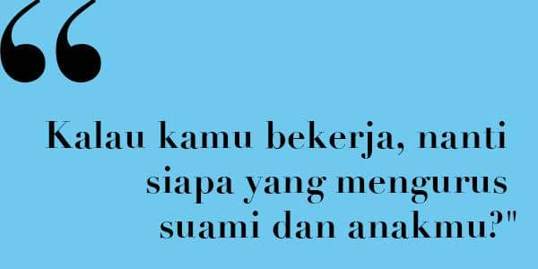 Anggapan bahwa pencari nafkah sebenarnya hanya laki-laki saja masih kuat di masyarakat kita yang memang patriarkat. Laki-laki dianggap lebih memiliki kuasa dan kemampuan dalam bekerja. Padahal perempuan pun banyak yang memiliki bakat di berbagai bidang publik, termasuk pekerjaan yang dianggap sangat maskulin seperti teknisi dan kedokteran. Hari ini, aku baru tahu kalau kenyataannya memang masih sepahit itu. Aku harus keluar dari pekerjaanku karena menikah.