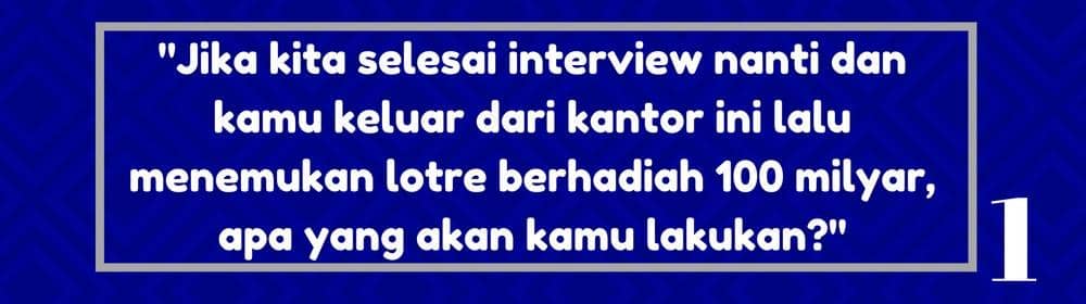 Dari sekian jenis tes seleksi masuk kerja, mungkin interview adalah tahap yang paling menegangkan bagi sebagian orang. Di samping harus berhadapan langsung dengan orang asing yang posisinya lebih tinggi dan lebih senior dari kamu, bayangan tentang pertanyaan yang sulit dijawab juga sukses buat kamu keringat dingin. Tapi apa jadinya ketika mereka melontarkan pertanyaan yang aneh, lucu, bahkan bisa membuat kamu bingung? Sebagian pertanyaaan memang diajukan untuk mengetes logika, tapi sisanya seperti pertanyaan iseng. Coba deh, kalau kamu ditanya soal ini, kamu bakal jawab apa?