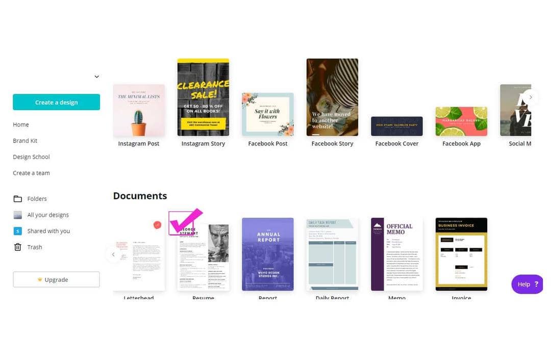 1. Setelah membuka canva.com dan log in. Klik bagian ‘Create Design’, lalu klik ‘Resume’ pada bagian ‘Document’.