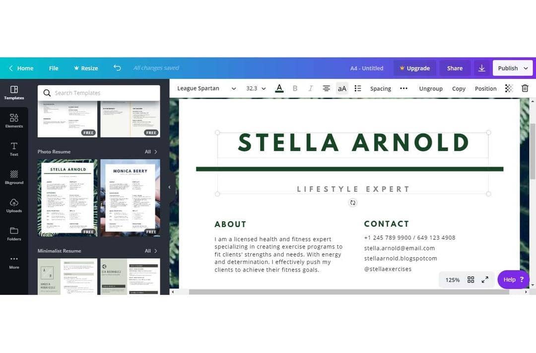 2. Lalu Canva akan mengarahkan mu untuk memilih desain layout yang tersedia. Ada yang gratis, ada pula yang berbayar. Tapi layout gratis juga nggak kalah menarik kok dibanding berbayar. Jika sudah memilih desain yang kamu suka, kamu sudah bisa mengedit konten CV