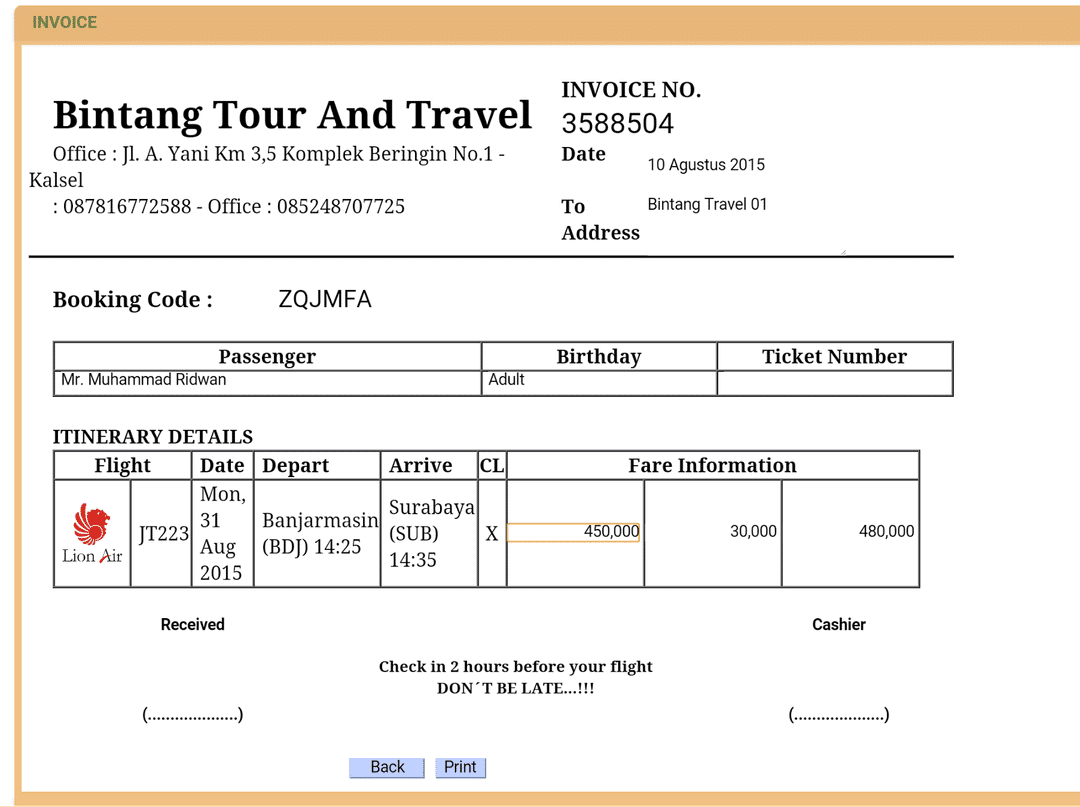 Invoice travel dan tur perjalanan akan dikeluarkan jika kita memesan jasa perjalanan. Misalnya, memesan tiket pesawat terbang atau paket wisata dengan tujuan tertentu. Dalam invoice akan tertulis tujuan perjalanan yang kita pilih, jumlah tiket, dan biaya yang harus dibayarkan dalam tenggat waktu yang telah ditentukan.